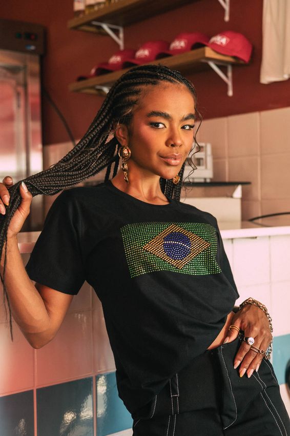 / Coleção Alma Brasileira -T-shirt Bandeira Strass Preta